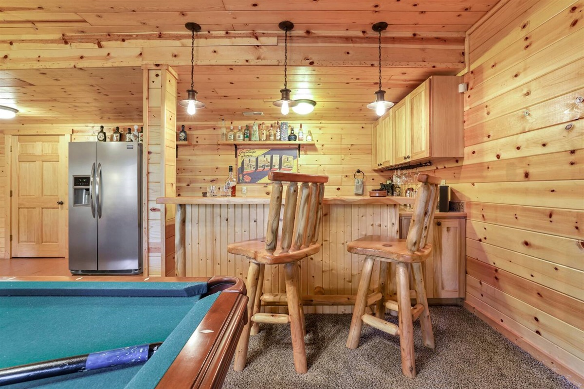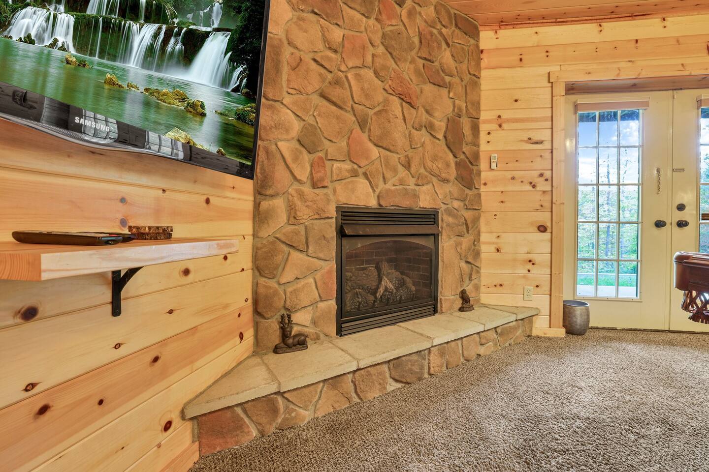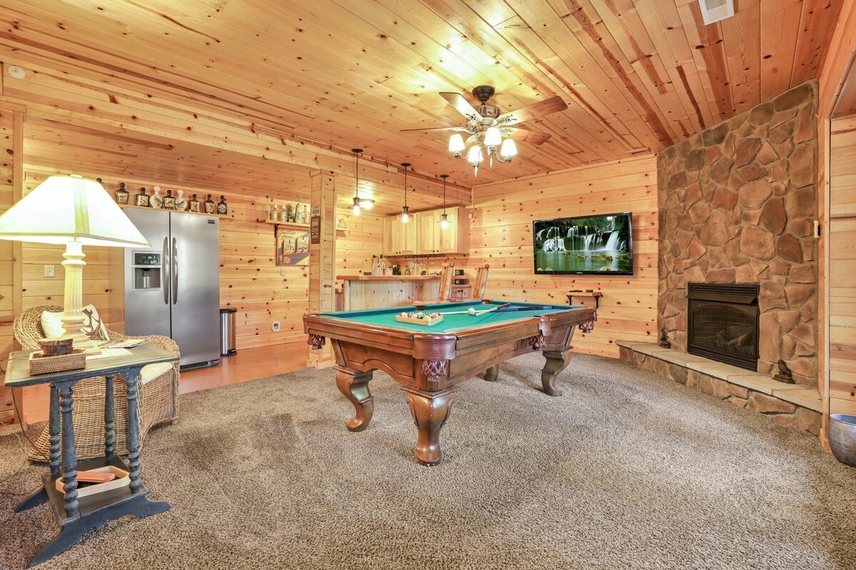 Basement hangout area - features pool table, fireplace, bar area and TV.